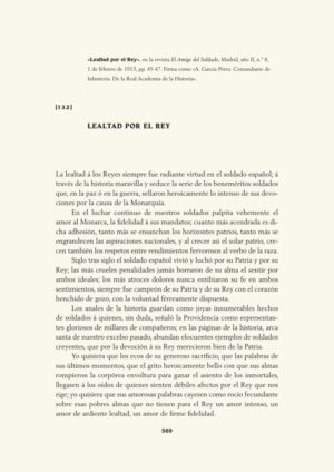 La lealtad á los Reyes siempre fue radiante virtud en el soldado español á través de la historia maravilla y seduce la serie de los beneméritos soldados que, en la paz ó en la guerra, sellaron heroicamente lo intenso de sus devociones por la causa de la Monarquía. En el luchar continuo de nuestros soldados palpita vehemente el amor al Monarca, la fidelidad á sus mandatos cuanto más acendrada es dicha adhesión, tanto más se ensanchan los horizontes patrios, tanto más se engrandecen las aspiraciones nacionales, y al crecer así el solar patrio, crecen también los respetos entre rendimientos fervorosos al verbo de la raza. Siglo tras siglo el soldado español vivió y luchó por su Patria y por su Rey las más crueles penalidades jamás borraron de su alma el sentir por ambos ideales los más atroces dolores nunca entibiaron su fe en ambos sentimientos, siempre fue campeón de su Patria y de su Rey con el corazón henchido de gozo, con la voluntad férreamente dispuesta. Los anales de la historia guardan como joyas innumerables hechos de soldados á quienes, sin duda, señaló la Providencia como representantes gloriosos de millares de compañeros en las páginas de la historia, arca santa de nuestro excelso pasado, abundan elocuentes ejemplos de soldados creyentes, que por la devoción á su Rey merecieron bien de la Patria.