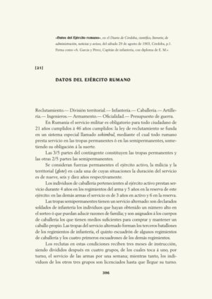 División territorial.— Infantería.— Caballería.— Artille[1]ría.— Ingenieros.— Armamento.— Oficialidad.— Presupuesto de guerra. En Rumanía el servicio militar es obligatorio para todo ciudadano de 21 años cumplidos á 46 años cumplidos: la ley de reclutamiento se funda en un sistema especial llamado sohimbul, mediante el cual todo rumano presta servicio en las tropas permanentes ó en las semipermanentes, sometiendo su obligación á la suerte. Las 3/5 partes del contingente constituyen las tropas permanentes y las otras 2/5 partes las semipermanentes. Se consideran fuerzas permanentes el ejército activo, la milicia y la territorial (glote) en cada una de cuyas situaciones la duración del servicio es de nueve, seis y diez años respectivamente